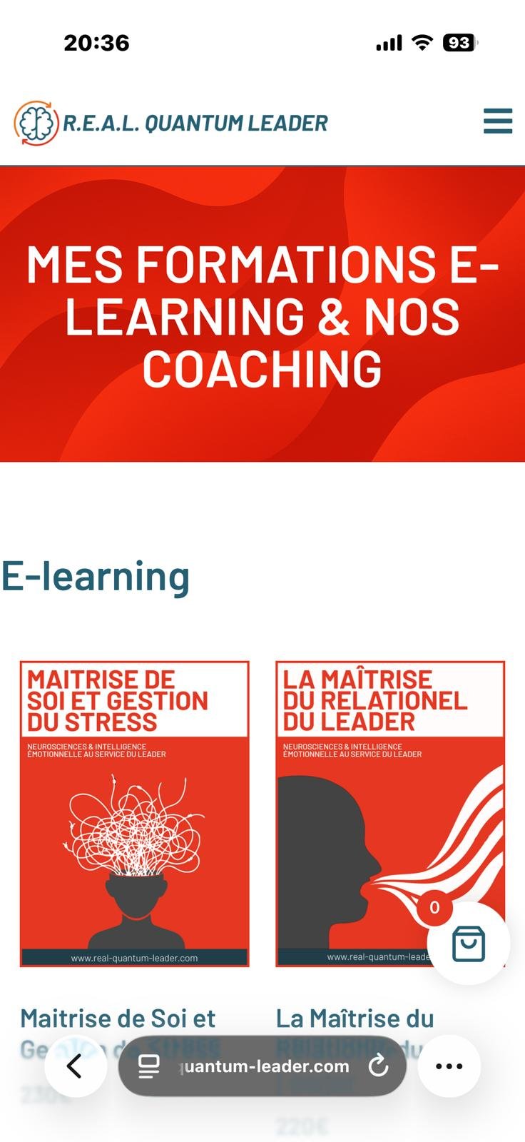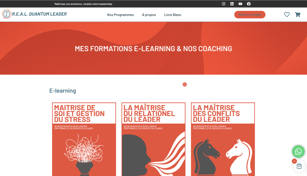 R.E.A.L. Quantum Leader propose une gamme complète de formations et coachings en ligne destinés aux leaders et aux managers aspirant à mieux gérer le stress, affiner leur leadership et renforcer leurs compétences en gestion, relationnel, prise de décision et gouvernance. Le site regroupe les offres e-learning, diagnostics de profil, et services de coaching premium, avec un système d’achat en ligne fluide et une interface claire. Chaque formation est présentée avec son tarif, son contenu et un accès au panier. Le tout est organisé de façon intuitive : page programmes, mon compte, panier, et modules de coaching sur mesure — offrant une expérience utilisateur simple et efficace.