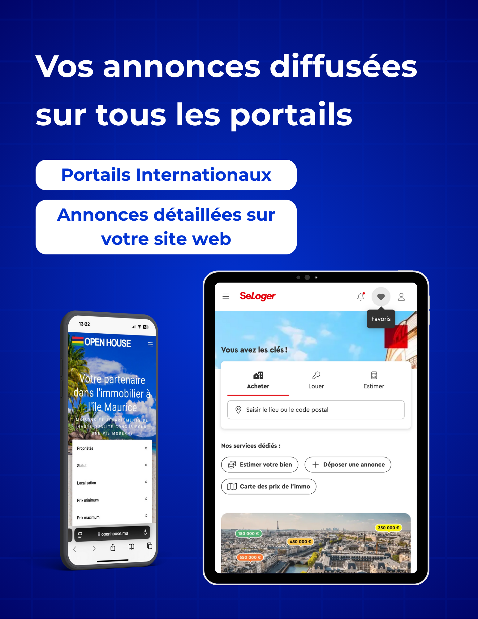Présentez l’ensemble de vos biens sur un site immobilier performant, et assurez leur diffusion sur les principaux portails nationaux et internationaux. Chez Skyward Agency, nous créons des sites sur mesure qui centralisent vos annonces, augmentent votre visibilité et génèrent des contacts qualifiés, pour booster vos ventes et locations.